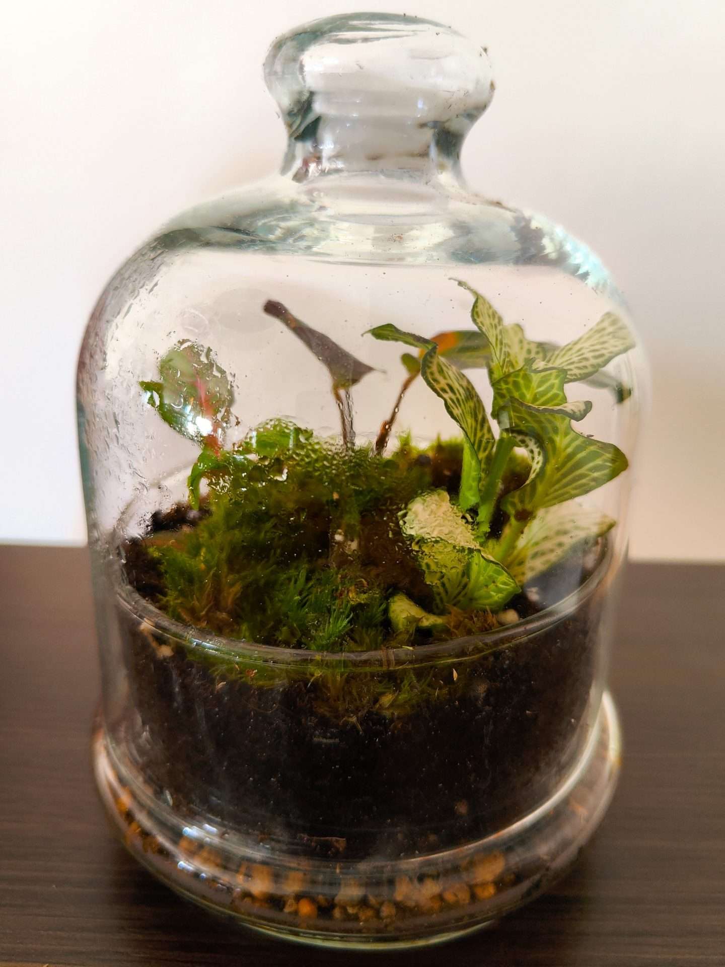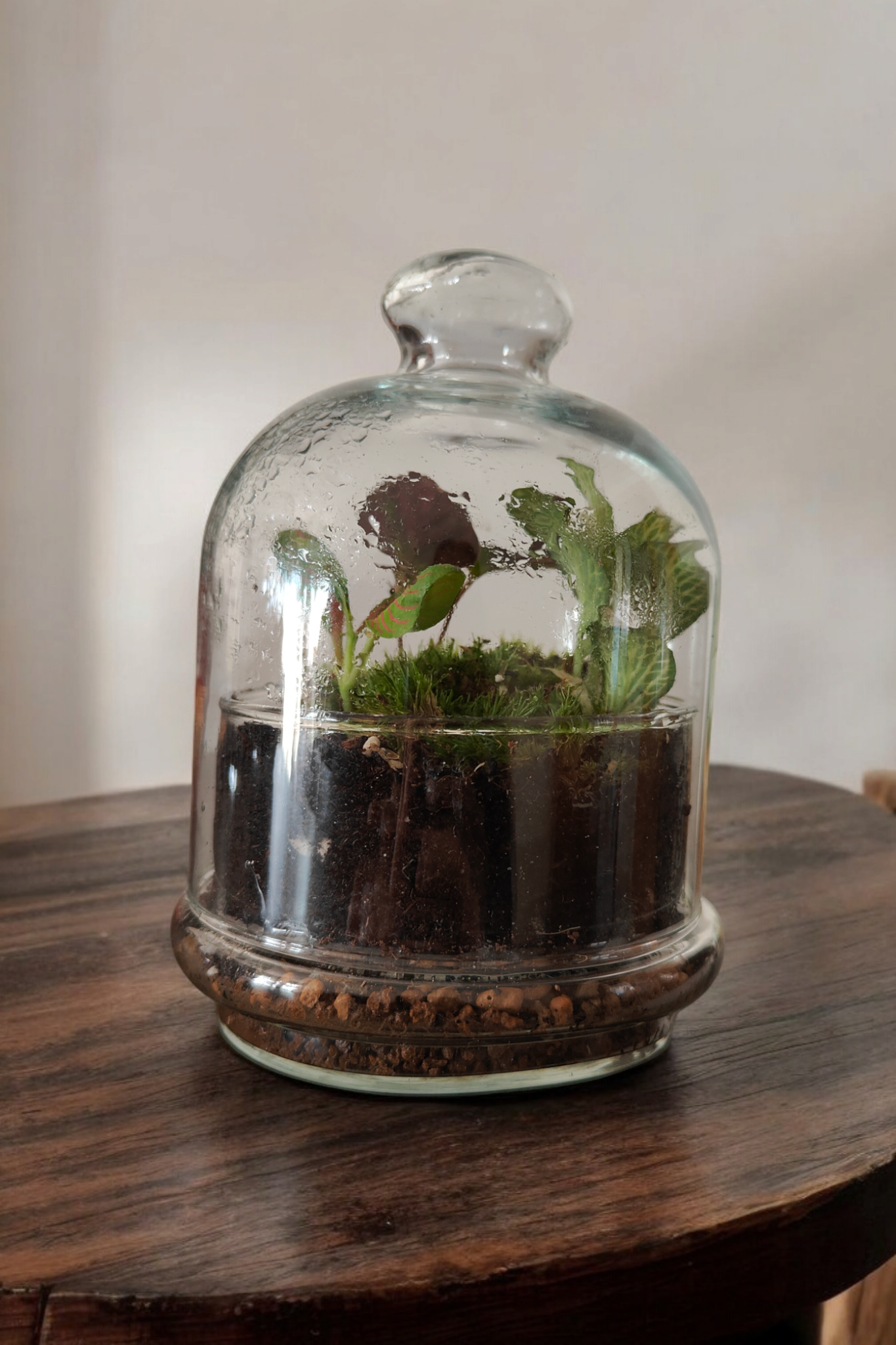Este es un terrario cerrado, lo que quiere decir que debe tener una concentración de humedad mínima y más o menos constante, que debe darle la luz, pero de forma indirecta, y que no se debe abrir la tapa excepto para manipularlo en momentos específicos.