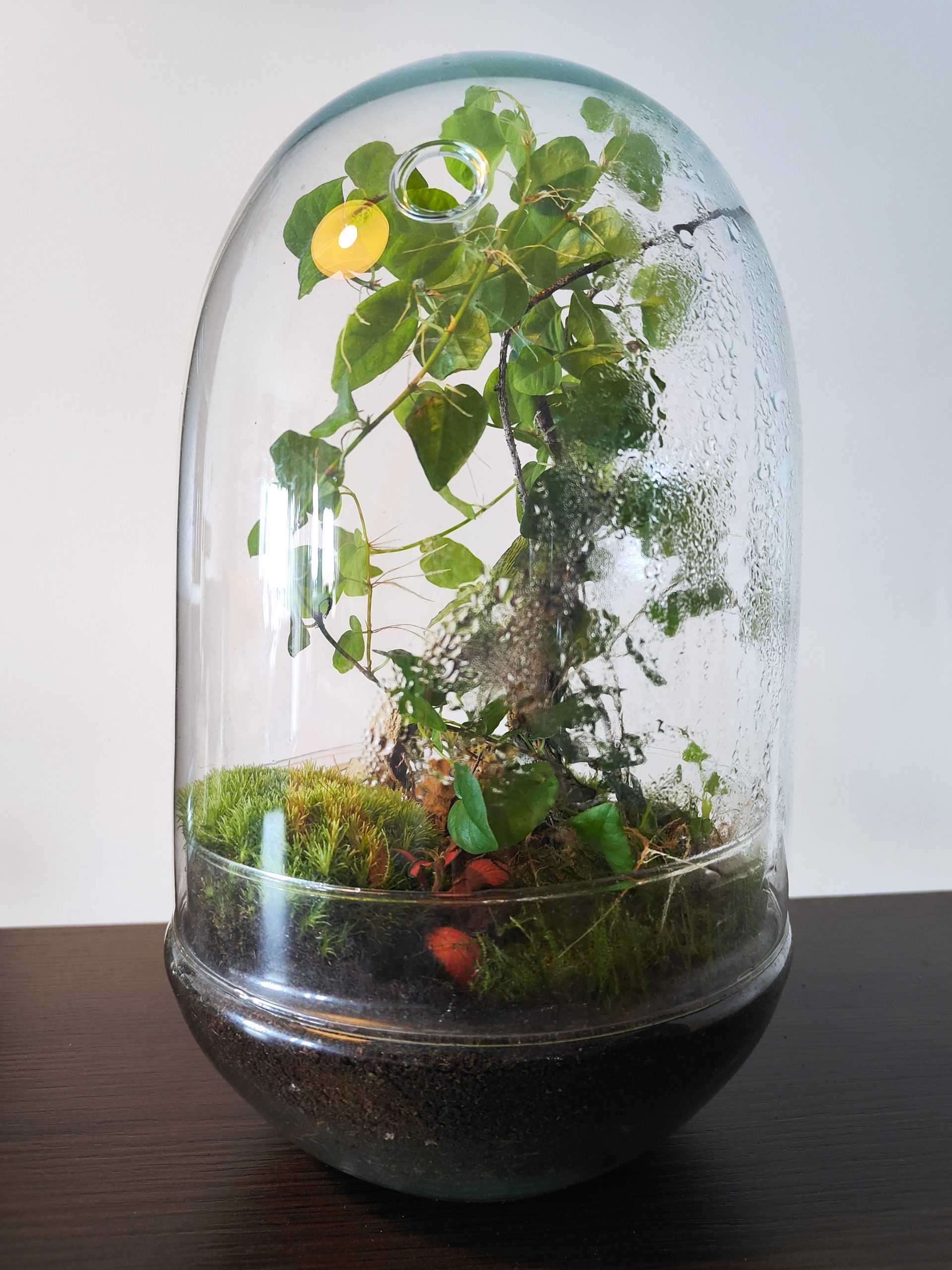 Este es un terrario cerrado, lo que quiere decir que debe tener una concentración de humedad mínima y más o menos constante, que debe darle la luz, pero de forma indirecta, y que no se debe abrir la tapa excepto para manipularlo en momentos específicos.
